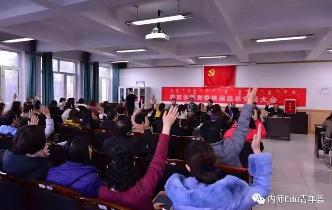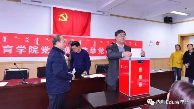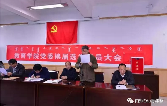 2018年11月29日下午,教育学院党委换届选举党员大会于赛罕校区文史楼一号会议室隆重举行,内蒙古师范大学组织部干部科科长陈宏研同志、教育学院党委书记铁木尔同志、教育学院院长米俊魁同志、教育学院党委副书记兼副院长王利同志、教育学院副院长何士同志、教育学院副院长边琦同志出席会议,教育学院全体教工党员和学生正式党员90人参加大会,学生预备党员30人列席大会,王利同志主持选举大会。