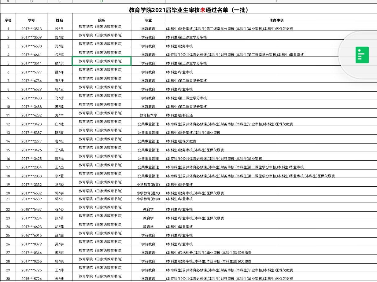 教育学院2021届毕业生审核通过名单(一批)以及未通过名单公示